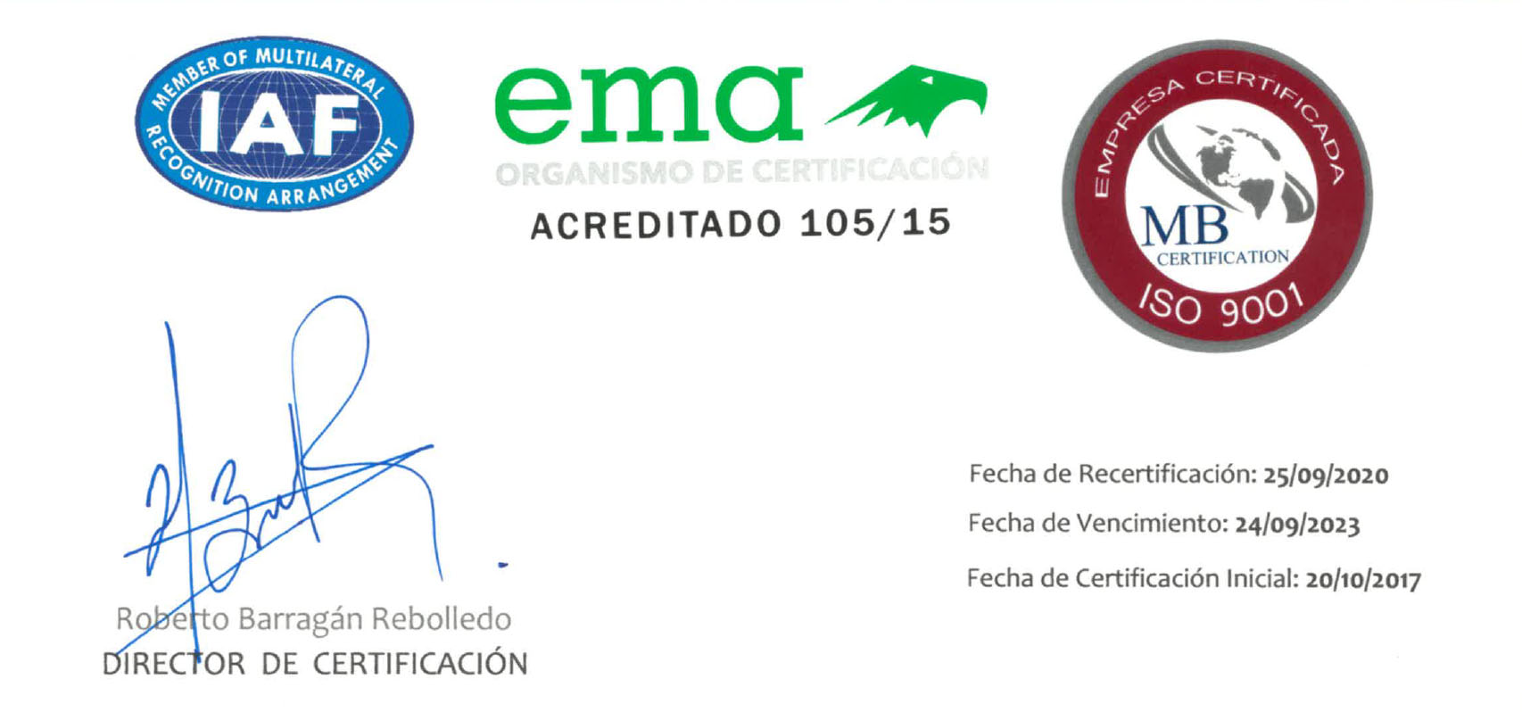 | R&M Queretaro- San Luis, S.A. DE C.V. Certificados: MBC/00343-A/SGC MBC/00343-A/SGA | “Operación, Conservación (Manteniento Menor), Rehabilitación (Mantenimiento Mayor), Explotación, Supervisión y Administración de Vías Terrestres y Edificaciones” |